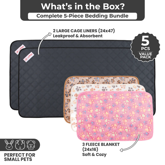 Washable Rabbit & Guinea Pig Cage Liners - Value Pack 5-Piece - Two Midwest or C&C 2X4 Bedding Mats and 3 Fleece Blankets
