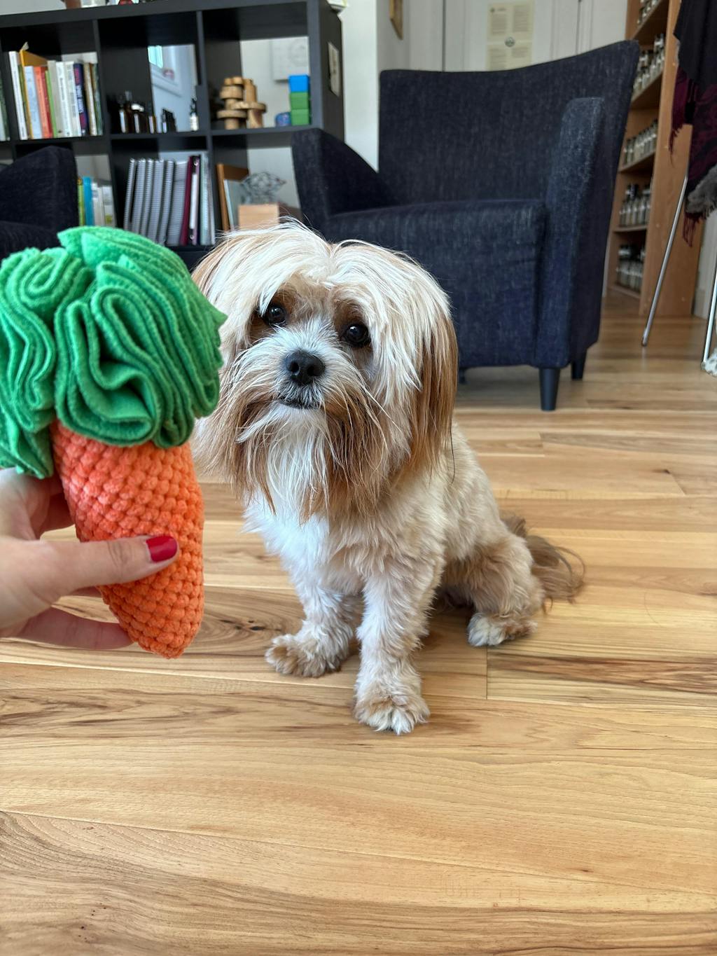 Georgie fell in love with the Carrot snuffle toy right away — especially because it squeaks! He carries it with him wherever he goes.