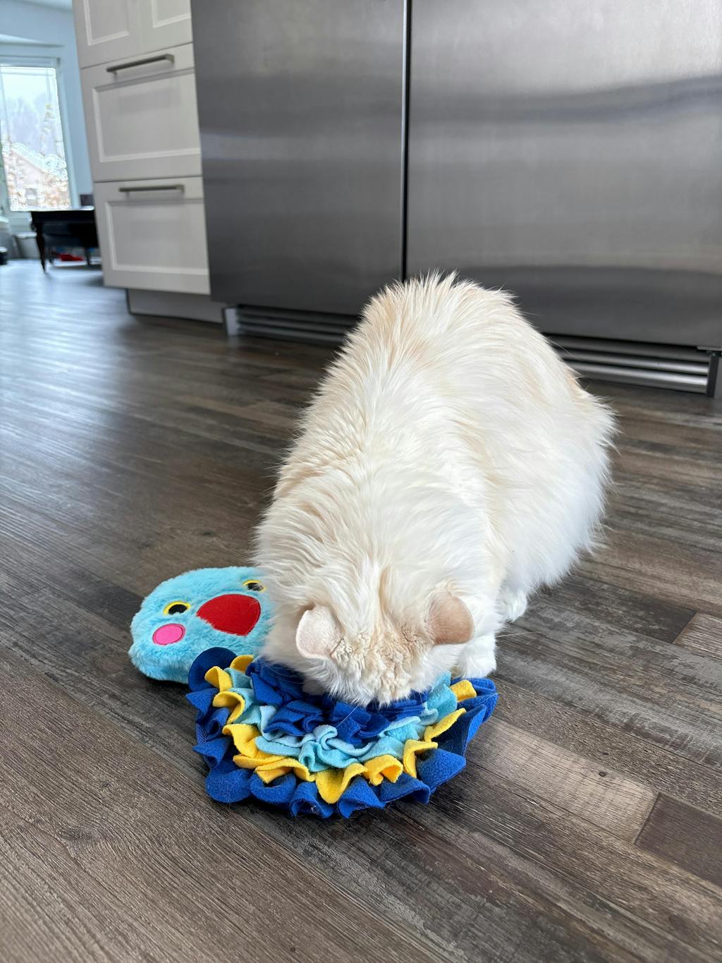It keeps them busy, the fabric feels secure and durable, and it’s soft and comfortable for their paws and faces. Another great option for feline enrichment that actually works.