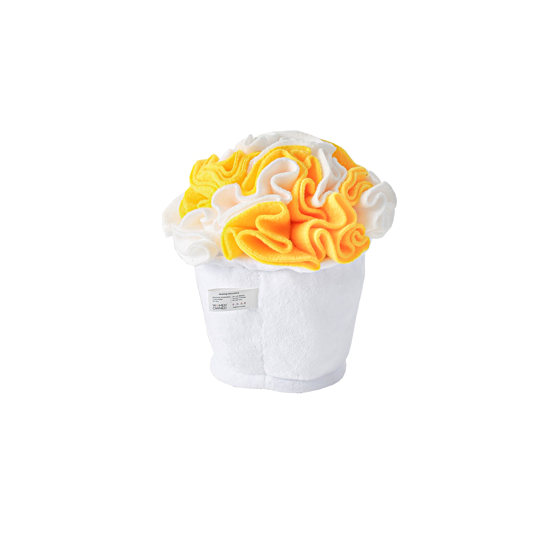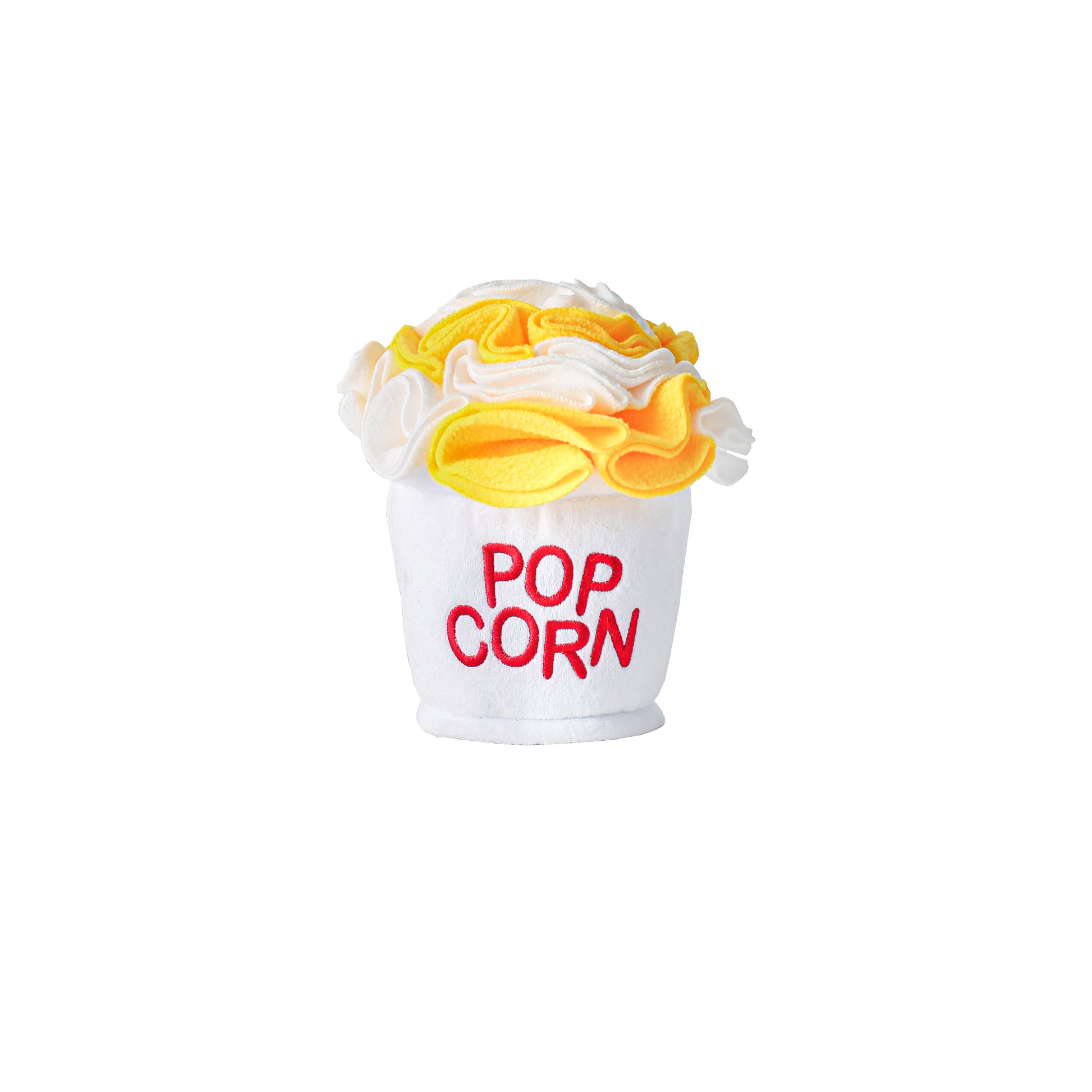 - DESIGN AND MATERIAL Crafted with soft, durable, and non-toxic polar fleece, this toy features a plush popcorn bucket with fluffy, removable popcorn pieces for hiding treats. The bucket includes a crinkly layer for a satisfying sound.